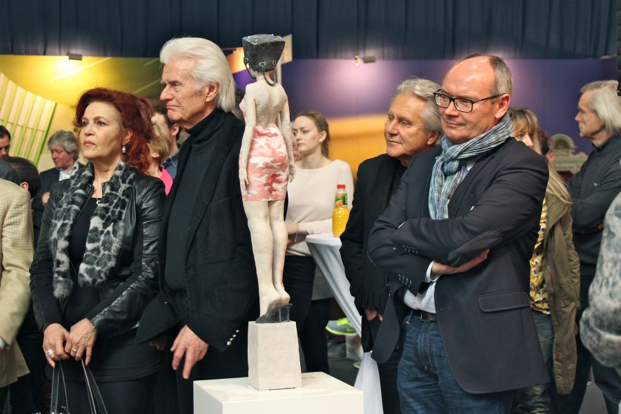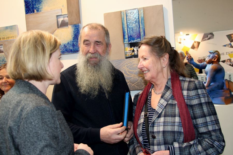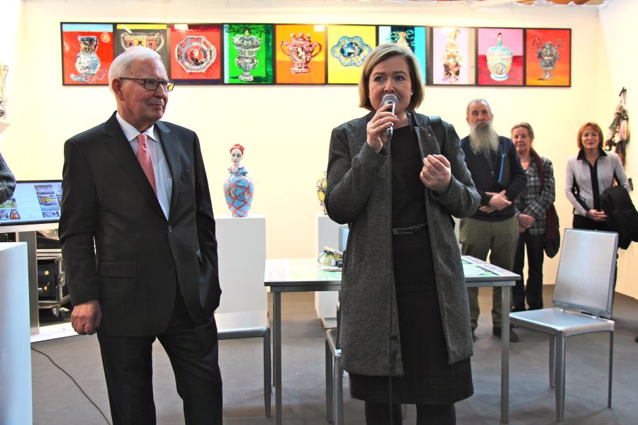 Über 100 Gäste nahmen in diesem Jahr am traditionellen art-Empfang der Majolika-Stiftung teil. Stiftungsvorstand Klaus Lindemann zeichnete in seiner Begrüßungsansprache ein zuversichtliches Bild der neu aufgestellten Manufaktur. Sie habe das Jahr gut begonnen und setze jetzt mit neuem Schwung konsequent das auch vom Karlsruher Gemeinderat getragene Fortführungskonzept um. Dies beinhalte die Profilierung des künstlerischen Markenkerns der Majolika, die Optimierung des Flächenbedarfs und der Produktionsabläufe, die Atelierarbeit und die personelle Umstrukturierung. Allerdings setze man darauf, dass von Seiten der städtischen Holding KVVH jetzt im Frühjahr die dringend notwendigen Sanierungsarbeiten zügig begonnen werden. Wichtig sei vor allem die Sanierung der vier ca. 20 Meter hohen Kamine, die zwar seit langem keine Funktion mehr haben, aber unter Denkmalschutz stehen und deshalb nicht abgerissen werden dürfen. Außerdem geht es um die Sanierungs- bzw. um Sicherungsmaßnahmen im Bereich Brandschutz und Barrierefreiheit. Diese Arbeiten sind eine wichtige Voraussetzung, dass die erheblichen Einschränkungen im Produktionsbetrieb der Manufaktur, die die Arbeit in den letzten Jahren stark belastet haben, so rasch wie nur irgend möglich aufgehoben werden können. Einen besonderen Dank richtete Klaus Lindemann an alle Künstlerinnen und Künstler, an die Gremien und an die Geschäftsleitung der Majolika GmbH und an alle, die sich als Freunde, Förderer und Kooperationspartner für eine gute Zukunftsentwicklung der Majolika einsetzen.