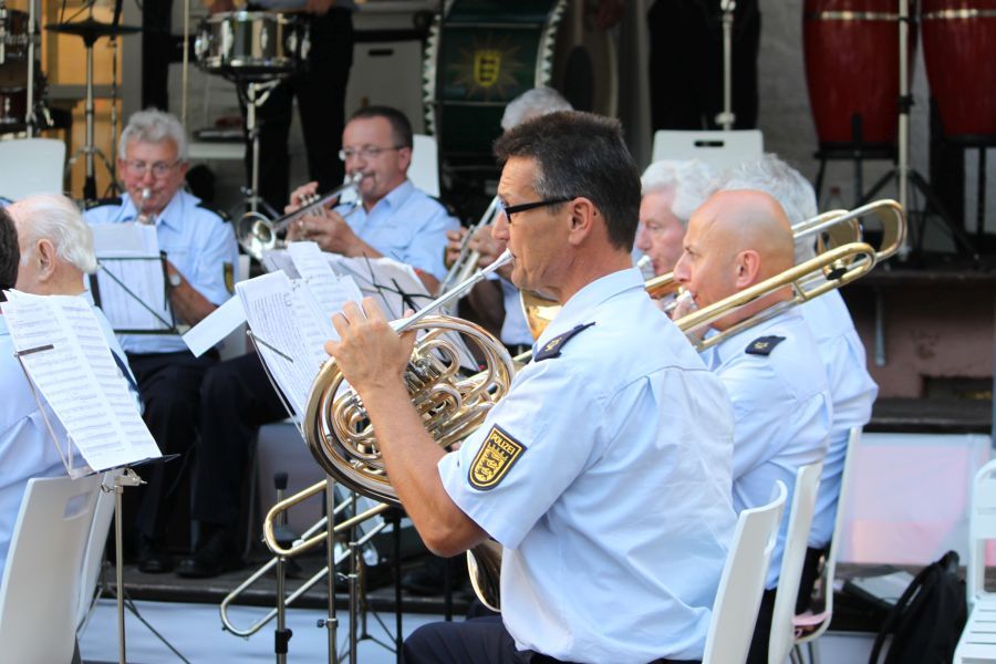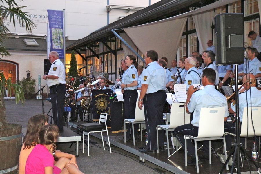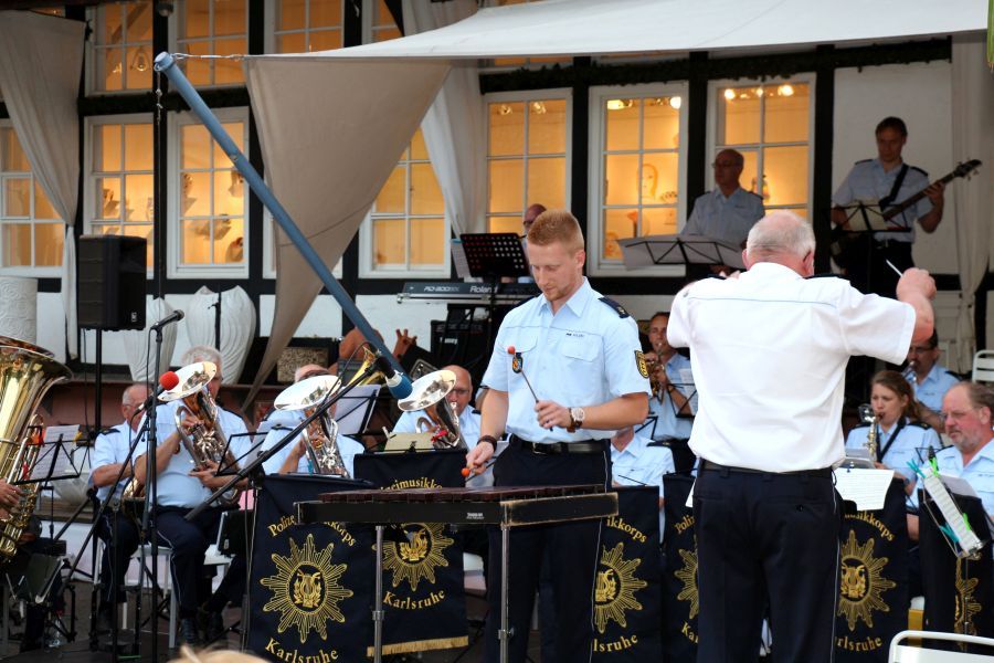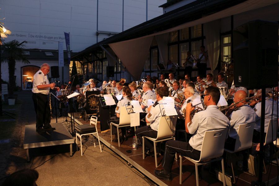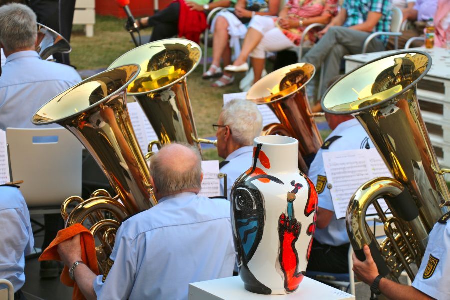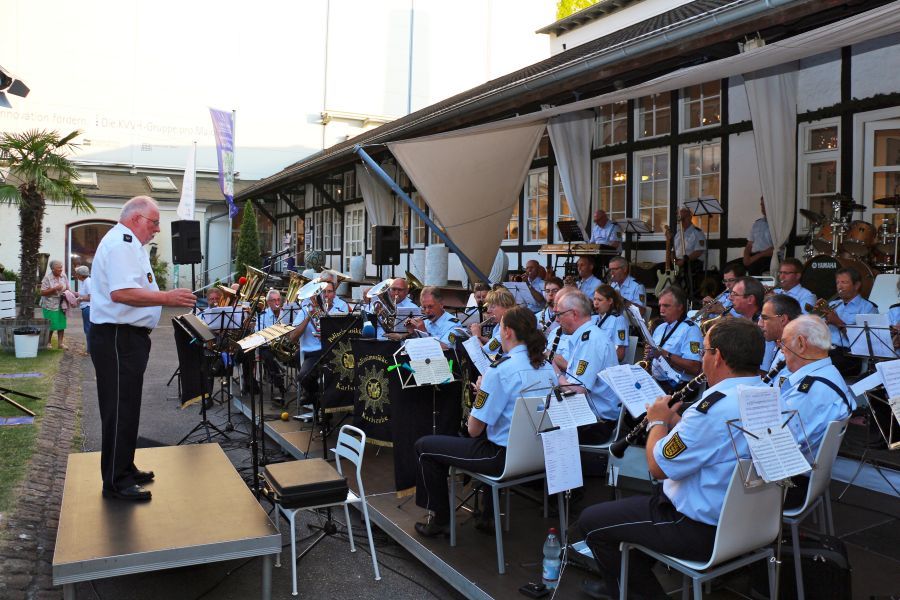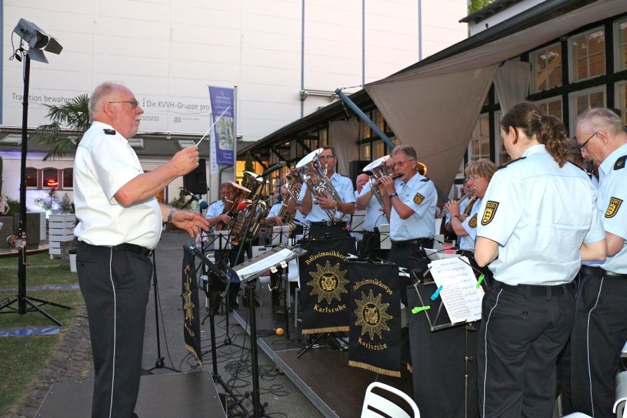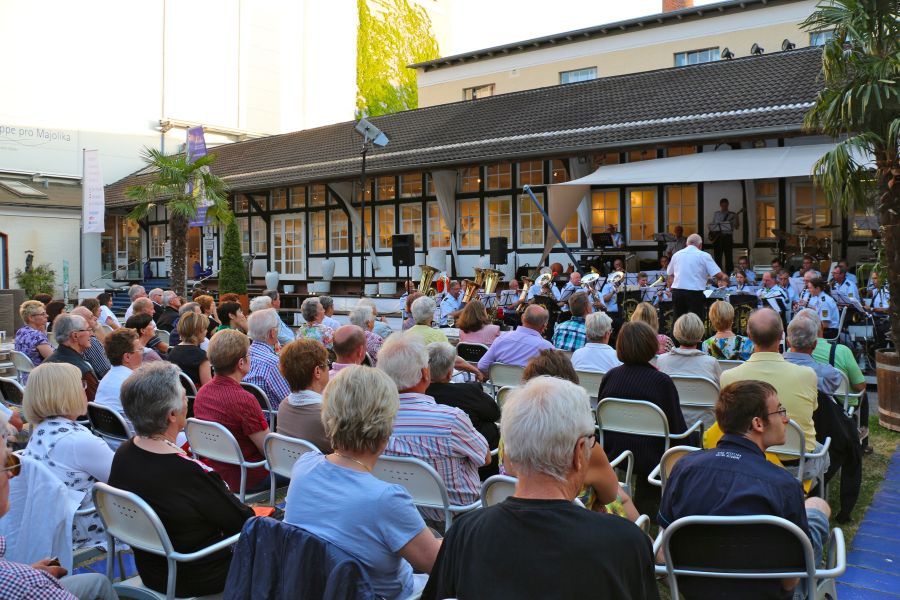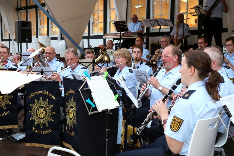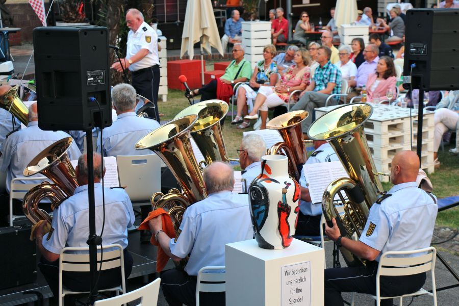 Auch das zweite Benefizkonzert des ebenso renommierten wie beliebten Polizeimusikkorps Karlsruhe zugunsten der Majolika-Stiftung im mediterranen Innenhof der Majolika Manufaktur am Ahaweg fand beim Publikum begeisterten Zuspruch. Auch die Presse war voll des Lobes für den wunderschönen Musikabend unter freiem Himmel.
