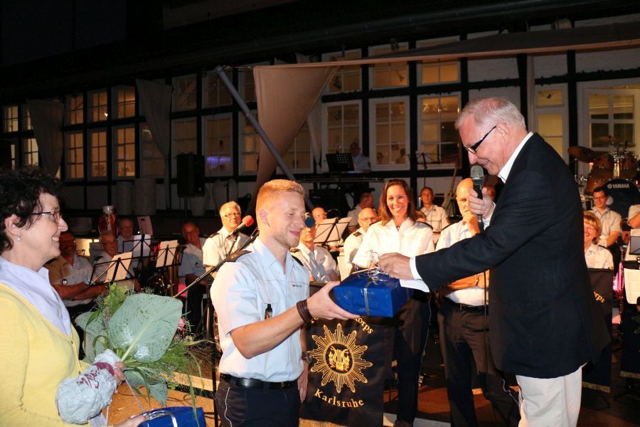 Einmal mehr wusste das Polizeimusikkorps unter der Leitung seines Dirigenten Heinz Bierling mit einem abwechslungsreichen und schwungvollen Repertoire zu begeistern und erhielt dafür lang anhaltenden Beifall. Anton Gramlich, der rührige Manager und erster Vorsitzender des Orchesters führte launig und kenntnisreich durch das bis in den späten Abend andauernde Programm. Stiftungsvorstand Klaus Lindemann bedankte sich bei allen Orchestermitgliedern für ihr großartiges Engagement und überreichte als kleines Zeichen der Anerkennung und hoher Wertschätzung den Solisten Claudia Pontes, Toni Bergsch, Frédéric Messner und Daniel Grabetz und natürlich dem Dirigenten den neuen offiziellen Jubiläumsbecher der Majolika zum 300. Stadtgeburtstag 2015. Unter den Ehrengäste konnte Klaus Lindemann u.a. die Karlsruher Ehrenbürgerin und ehemalige Regierungspräsidentin Gerlinde Hämmerle, die langjährige Polizeipräsidentin Hildegard Gerecke sowie den ehemaligen Chef des Brenners Parkhotel und Vizepräsidenten der Industrie- und Handelskammer Karlsruhe Richard Schmitz begrüßen, die auch bei diesem Abend, ihre besonderen Verbundenheit zur Majolika und zum Polizeimusikkorps zum Ausdruck brachten.
