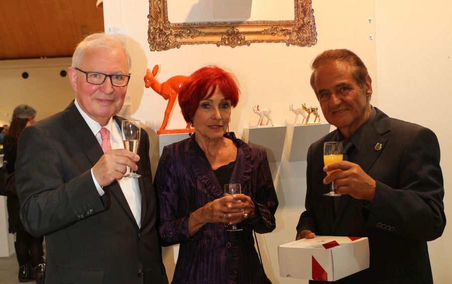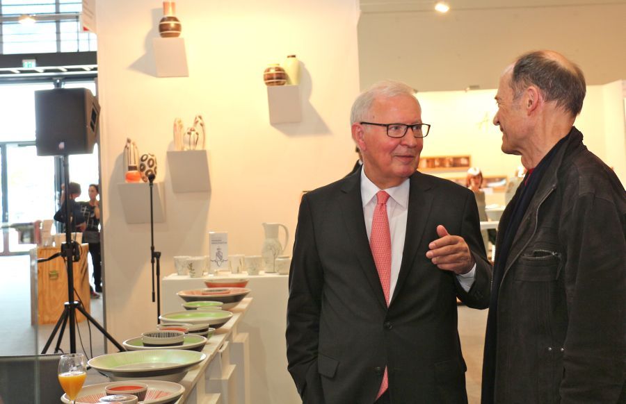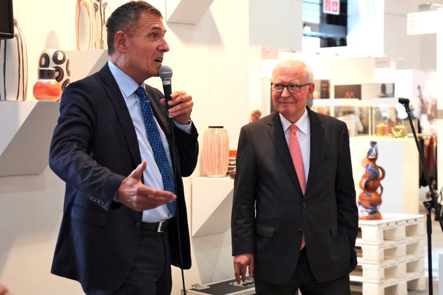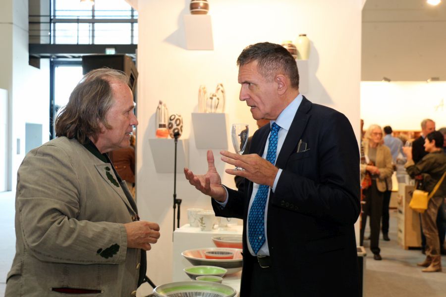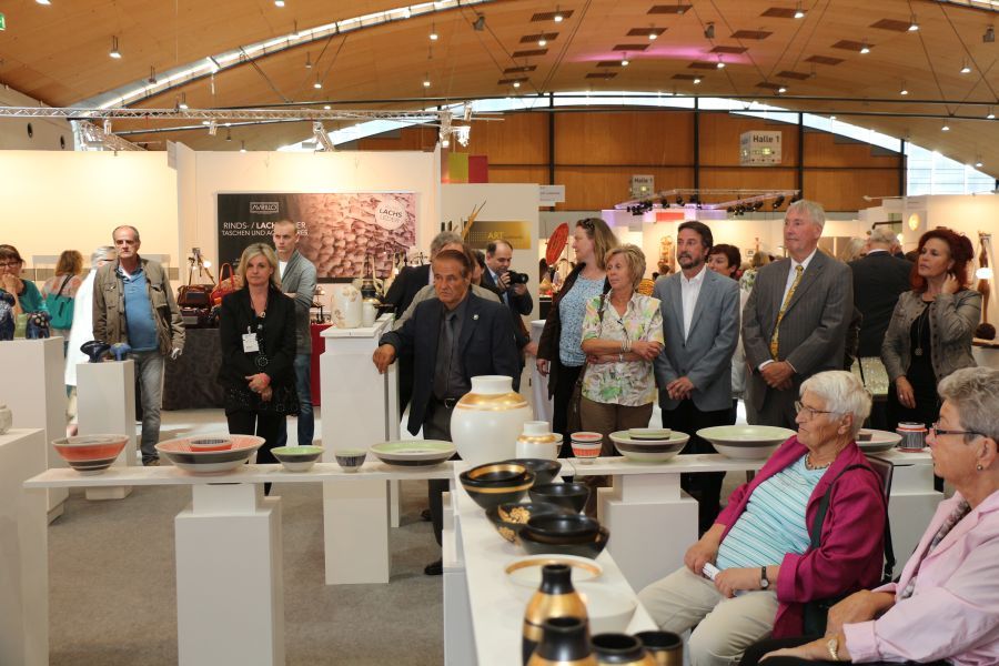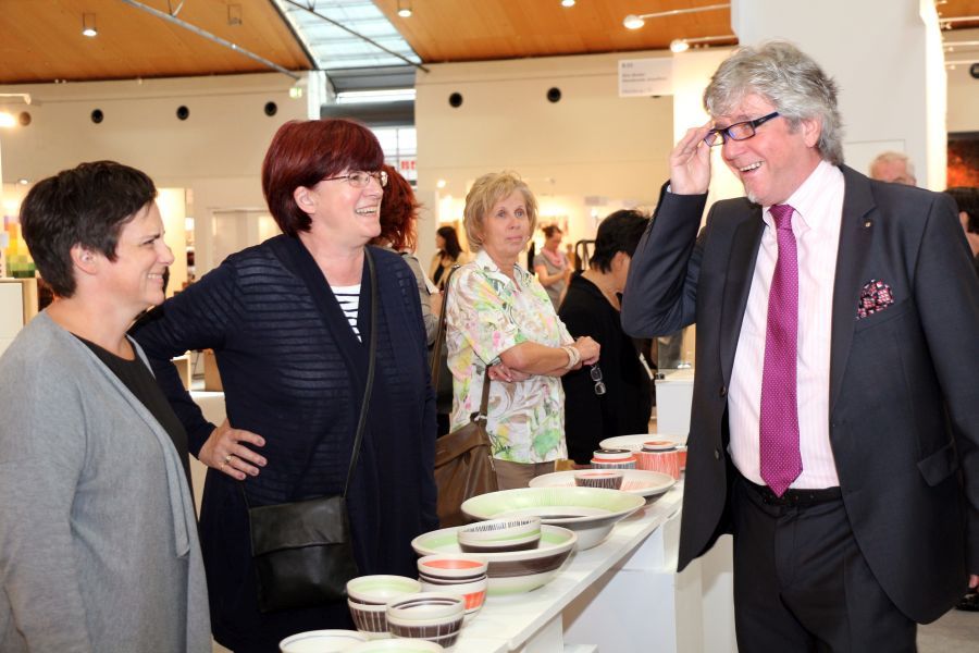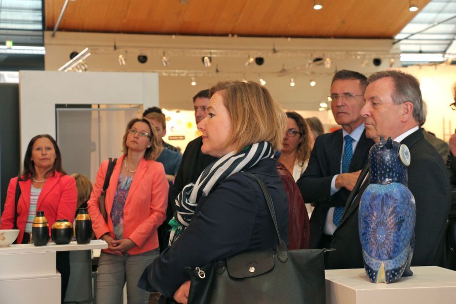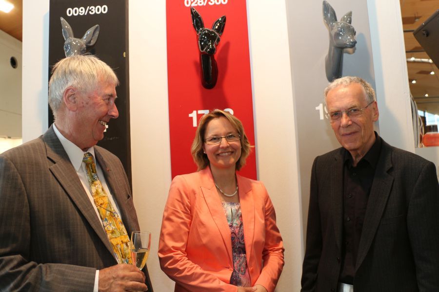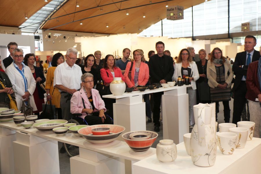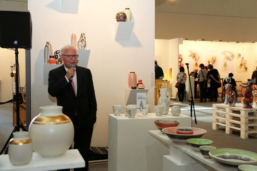 Dass die Majolika es geschafft habe trotz aller Schwierigkeiten und finanziellen Engpässen bis heute wunderschöne Kunst-Keramik zu produzieren, sei ein kleines Wunder und zugleich eine große Leistung aller, die den Fortbestand der Manufaktur gesichert hätten. Ihnen galt der besondere Dank des Stiftungsvorstands. Lindemann sprach die Hoffnung aus, dass es auch weiterhin gelingen möge, die Karlsruher Majolika Manufaktur als traditionsreiche europäische Vorzeige-Kunst-Keramik-Werkstatt in eine gute Zukunft zu führen. Dieser Hoffnung schlossen sich in ihren Grußworten die Chefin der Karlsruher Messe Britta Wirtz und der für Kunst und Kultur in Karlsruhe verantwortliche Erste Bürgermeister Wolfram Jäger uneingeschränkt an. Unter den Ehrengästen konnte Stiftungsvorstand Klaus Lindemann u.a. begrüßen die Landtagsabgeordnete Bettina Meier-Augenstein, Stadtrat, Dr. Albert Käuflein, Aufsichtsratsmitglied Gerhard J. Rastetter, Stiftungsratsmitglied Volker Fink, die für Stiftungsfragen im Regierungspräsidium zuständige Referentin Rita Schoch, den Politikberater Matthias Benz, Professor Axel Göhringer, Rechtsanwalt Helmut Kaul, Geschäftsführer Dr. Dieter Kistner sowie die Majolika-Künstlerinnen und Künstler, Enno-Ilka Uhde, Hannelore Langhans, Sybille Onnen, und Michael Rickelt.