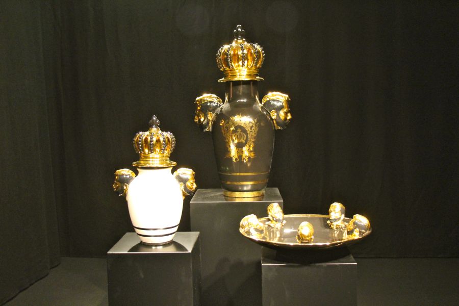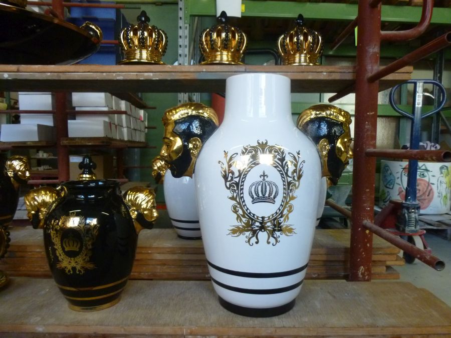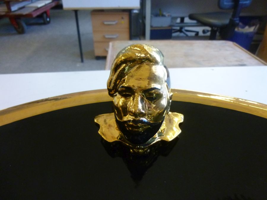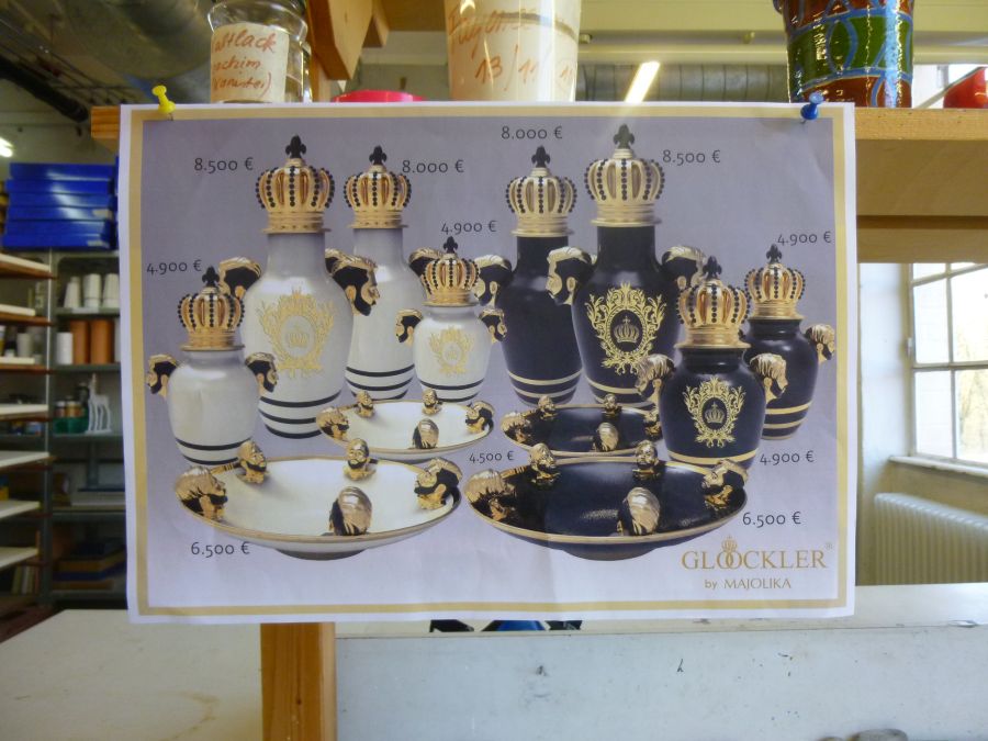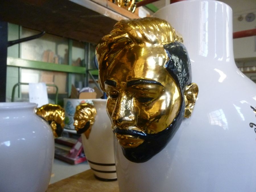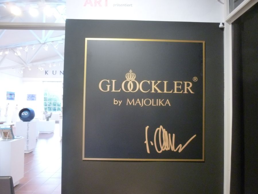 Gemeinsam mit der Majolika hat er jetzt erstmals keramische Arbeiten, die bislang in seinem Portfolio fehlten, realisiert: Schöne repräsentative Schalen und Vasen in Schwarz und Weiß, vergoldet und dekoriert mit seinem markanten Konterfei. Diese Arbeiten - unter Einbeziehung des neuen in der Majolika entwickelten innovativen 3D-Drucker-Systems gefertigt - sind bis zum 22. April 2018 in einer Sonderschau in der Majolika - Galerie im Ahaweg zusehen. Umrahmt werden die Exponate von einer Auswahl typischer Glööckler-Gemälde.