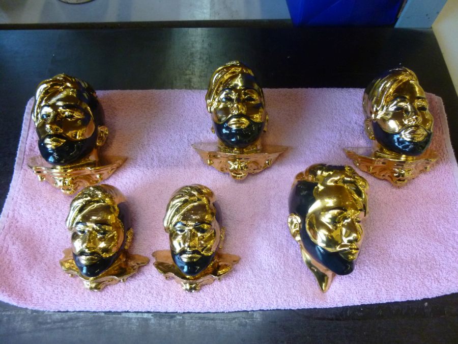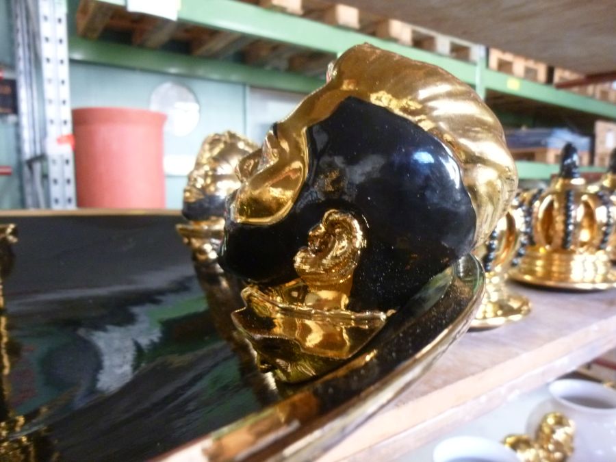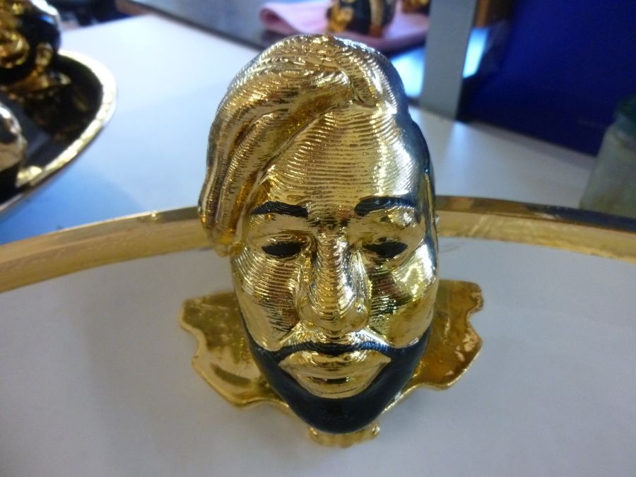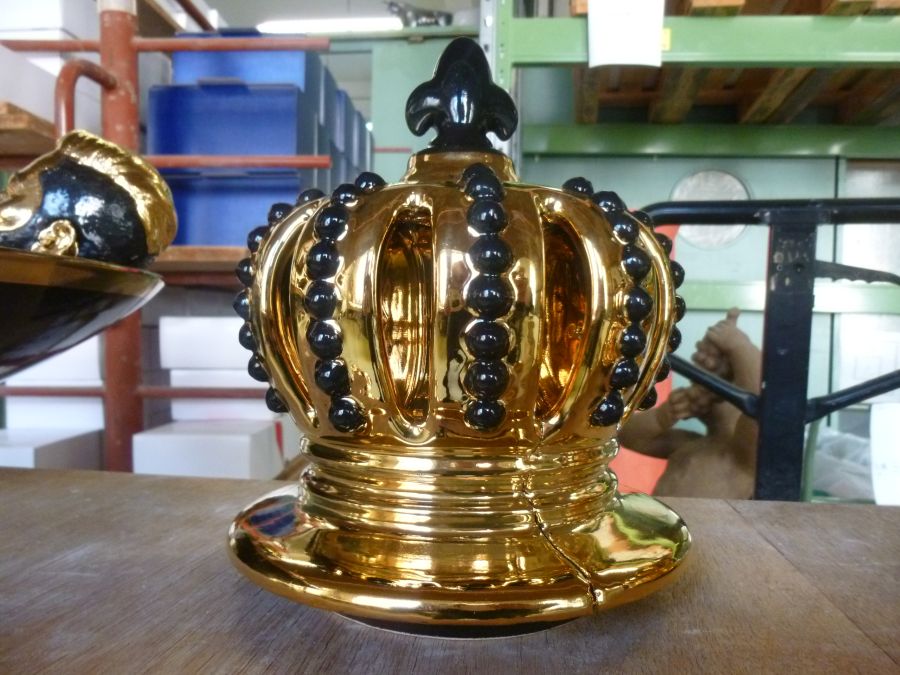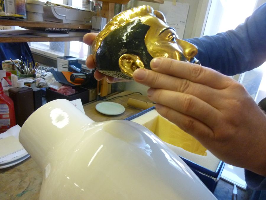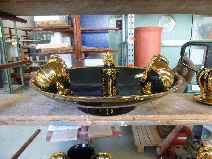 Gemeinsam mit der Majolika hat er jetzt erstmals keramische Arbeiten, die bislang in seinem Portfolio fehlten, realisiert: Schöne repräsentative Schalen und Vasen in Schwarz und Weiß, vergoldet und dekoriert mit seinem markanten Konterfei. Diese Arbeiten - unter Einbeziehung des neuen in der Majolika entwickelten innovativen 3D-Drucker-Systems gefertigt - sind bis zum 22. April 2018 in einer Sonderschau in der Majolika - Galerie im Ahaweg zusehen. Umrahmt werden die Exponate von einer Auswahl typischer Glööckler-Gemälde.